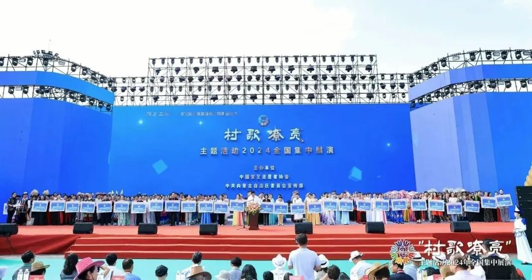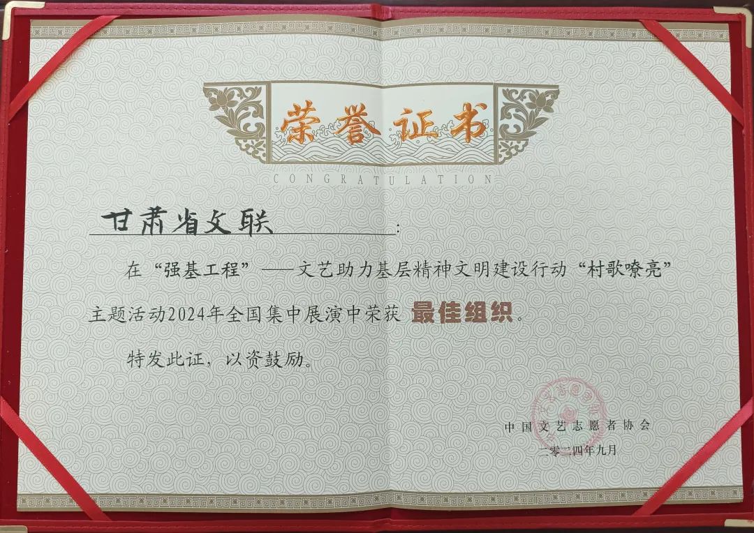9月19—21日,由中国文艺志愿者协会、中共内蒙古自治区委员会宣传部主办的“强基工程”文艺助力基层精神文明建设行动——“村歌嘹亮”主题活动2024全国集中展演在内蒙古鄂尔多斯市伊金霍洛旗成功举办。甘肃省文联选送的甘南州舟曲县杰迪佐瑞民歌合唱队、兰州市盐场路街道老年大学合唱团荣获“幸福好声音”称号,甘肃省文联荣获“最佳组织”称号。此次展演活动为期三天,包括开幕式、三场展演和一场优秀节目汇报演出,全国30个省(区、市)选派了55支优秀队伍,1000余人参加,展示55支广为流传的曲目和原创村歌作品,在参加省份数量、参演群众数量及展演规模上,均开创了文艺志愿服务活动的历史新高。