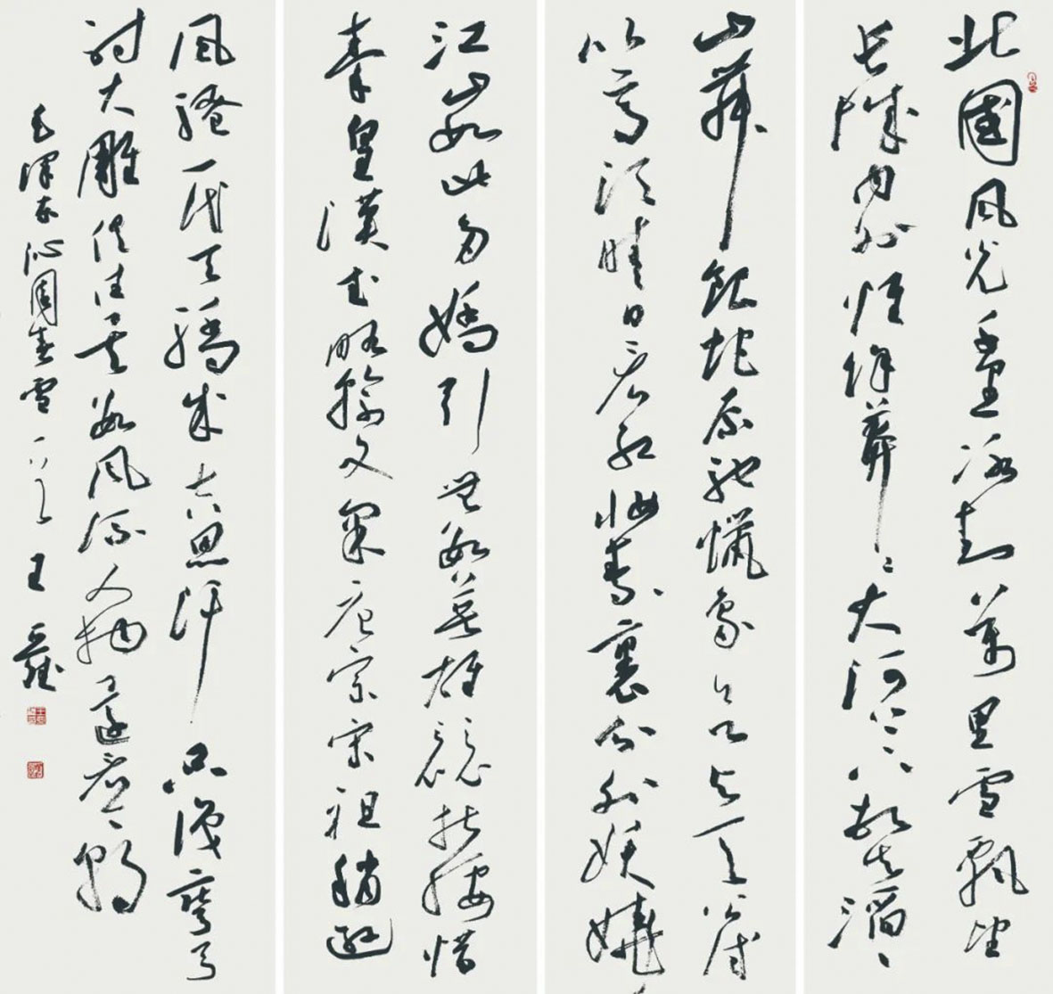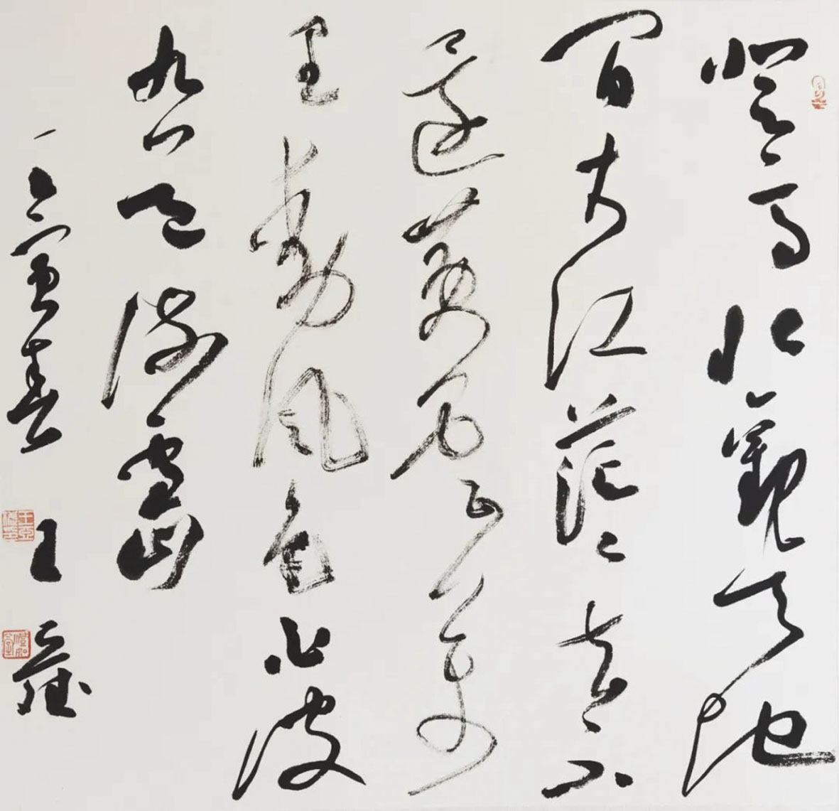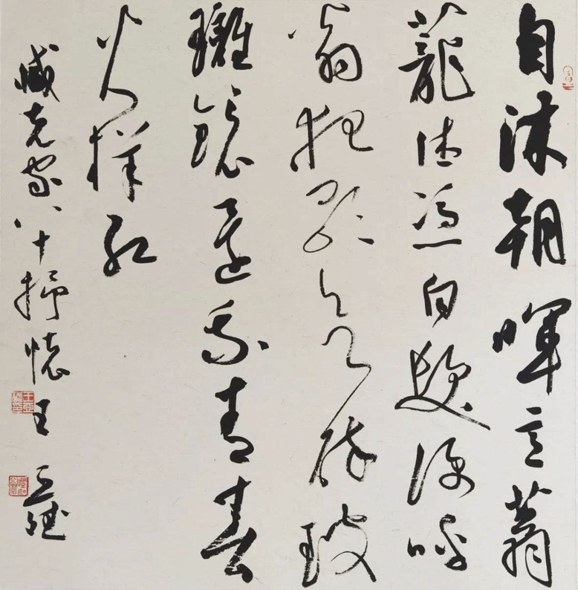 王亚斌临帖十分认真。学书既久,在审视当下书法创作的同时,他产生了一种比以往更强烈的深入传统的内驱力,这让他的笔墨越来越向经典法帖靠拢。如今,围绕法帖,王亚斌不再仅仅限于书法本体的学习,他进而深入研读相关书论,遥接古人情思,推想法帖墨迹中蕴含的生命轨迹。而后,再展开自己丰富的想象力,进一步发挥法帖的空间意识和笔法,进行创作,这不正是王铎所践行的“临创结合”之法乎?