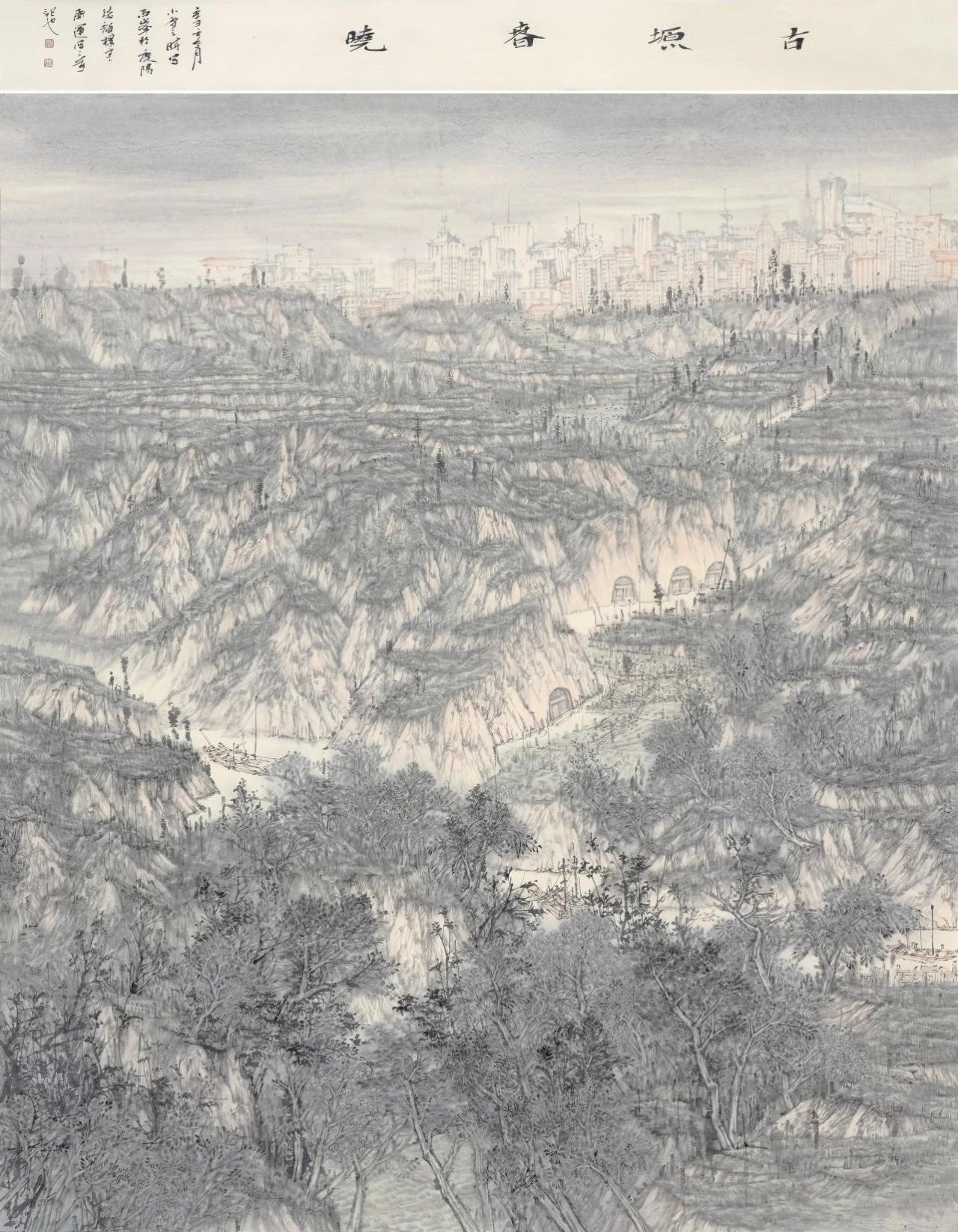 中国画《古塬春晓》描绘了陇东大塬初春雨后之景,画面以写生手法将农田、树林、沟壑、河流、窑洞、城市等独具陇东人文地貌的元素巧妙组合,直接、纯粹地表现了黄土高原的宽广浑厚与苍润之感。此作通篇宿墨湿画,以赭石、汁绿为主基调,画面整体清雅祥和,既展现了春日万物复苏的生命气息,也表达了新时代建设下人民对美好生活的希望。