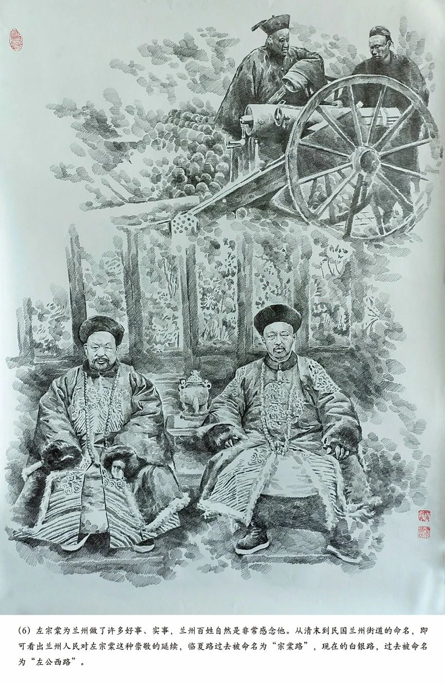 连环画《左宗棠与兰州》共由六幅画作组成,根据晚清兰州的历史文献资料以及左宗棠在兰州的活动过程进行创作,作品采用明暗素描的手法,重在表现左公对于兰州的历史贡献和近代军事、民用工业发展的启蒙作用,涵盖人文故事、地方特产、名街小巷、百年老厂的由来等内容。
