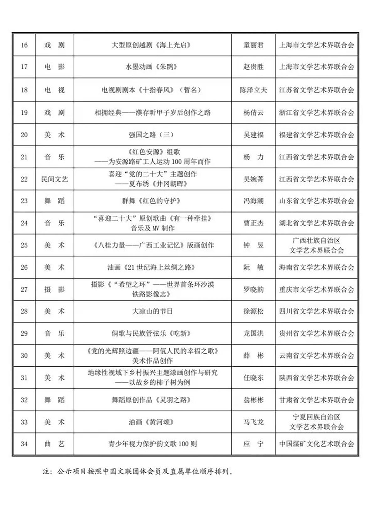 按照《中国文联2022年度青年文艺创作扶持计划项目评审办法》,中国文联组织相关艺术门类评委对申报项目进行了逐一审核和集中评审。通过严格规范的初评和复评,经中国文联党组(书记处)审批同意,中国文联2022年度青年文艺创作扶持计划拟资助项目34项,现予以公示。公示期间,对拟扶持项目如有异议,可来电来信提出意见,反映情况要客观属实、有理有据。
