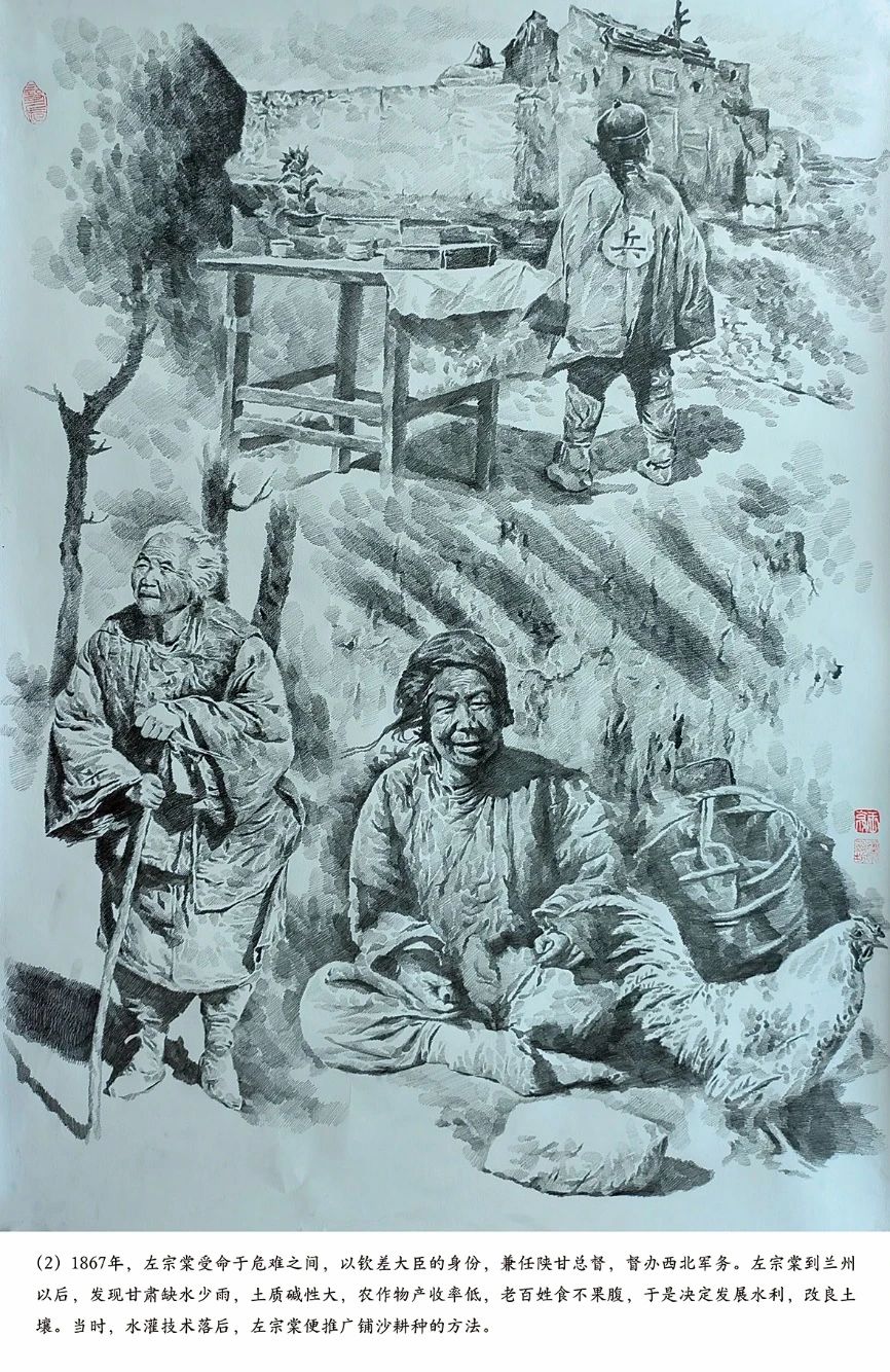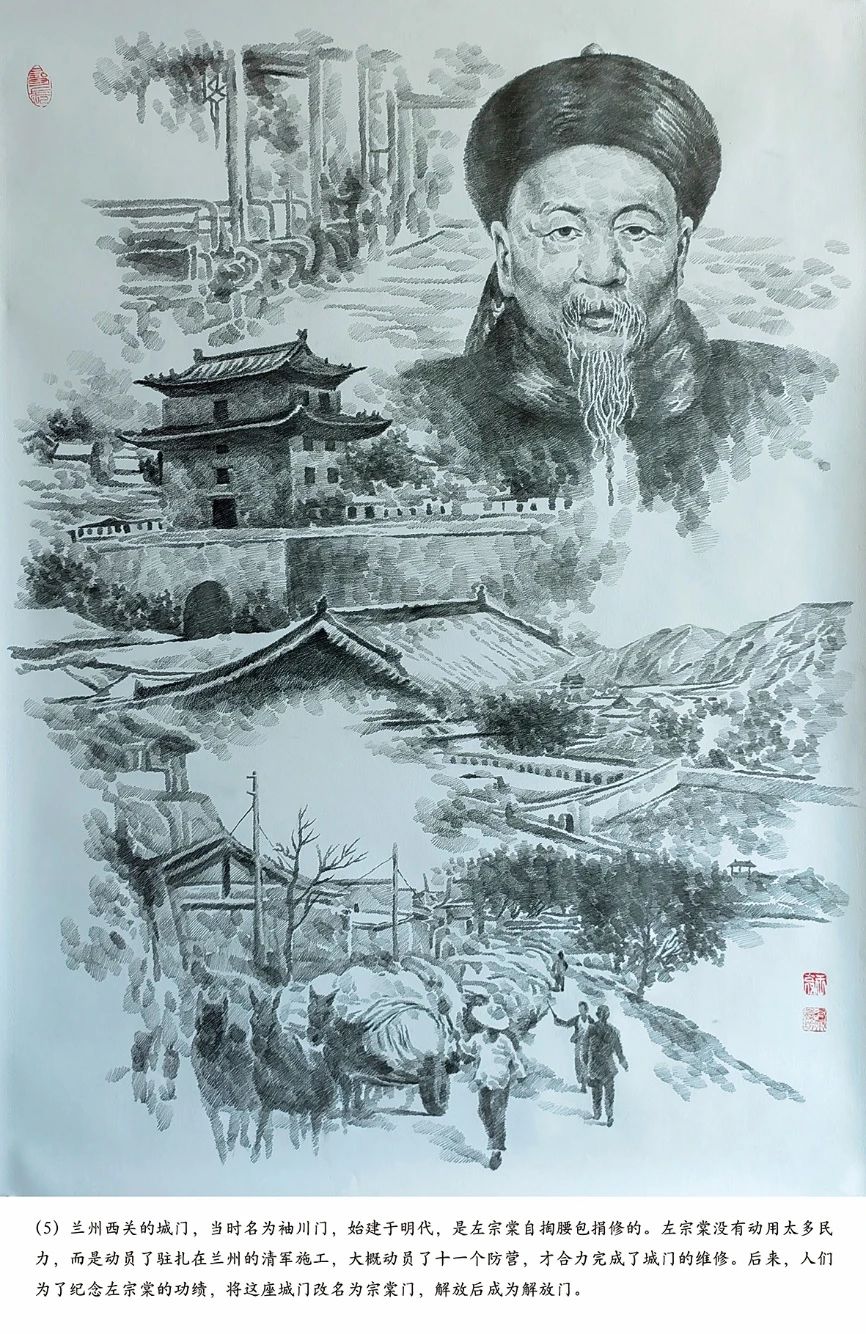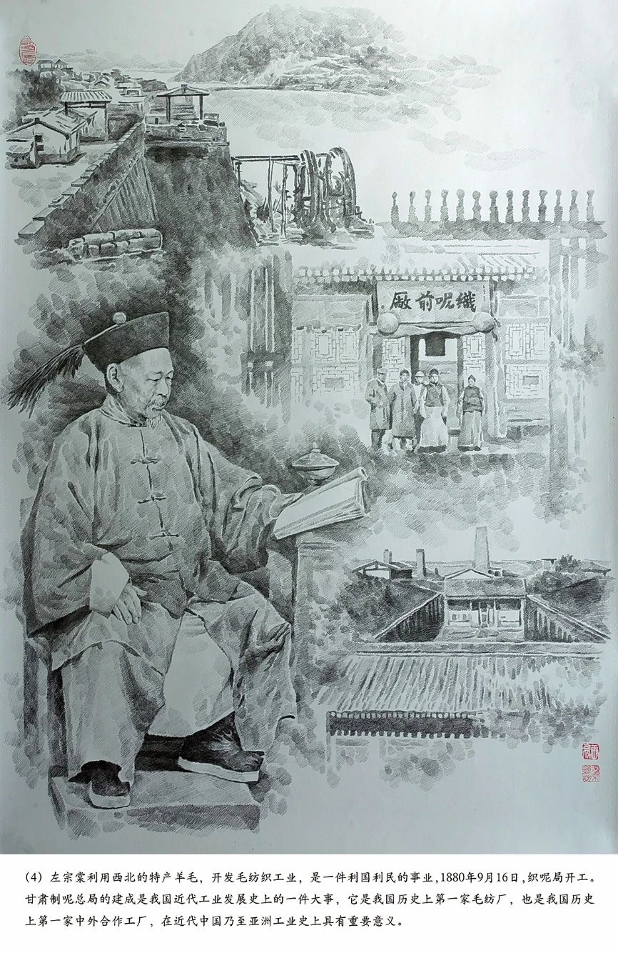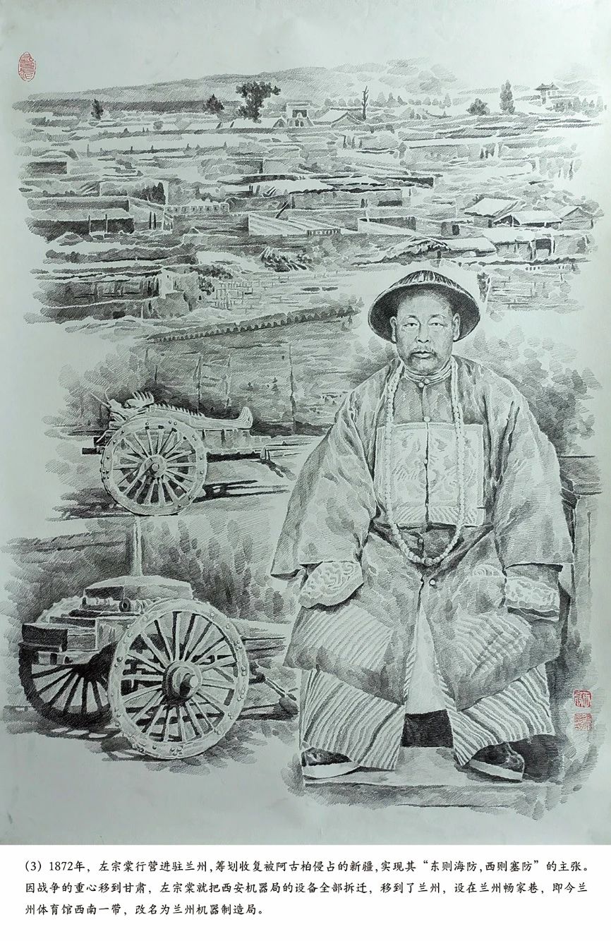 连环画《左宗棠与兰州》共由六幅画作组成,根据晚清兰州的历史文献资料以及左宗棠在兰州的活动过程进行创作,作品采用明暗素描的手法,重在表现左公对于兰州的历史贡献和近代军事、民用工业发展的启蒙作用,涵盖人文故事、地方特产、名街小巷、百年老厂的由来等内容。