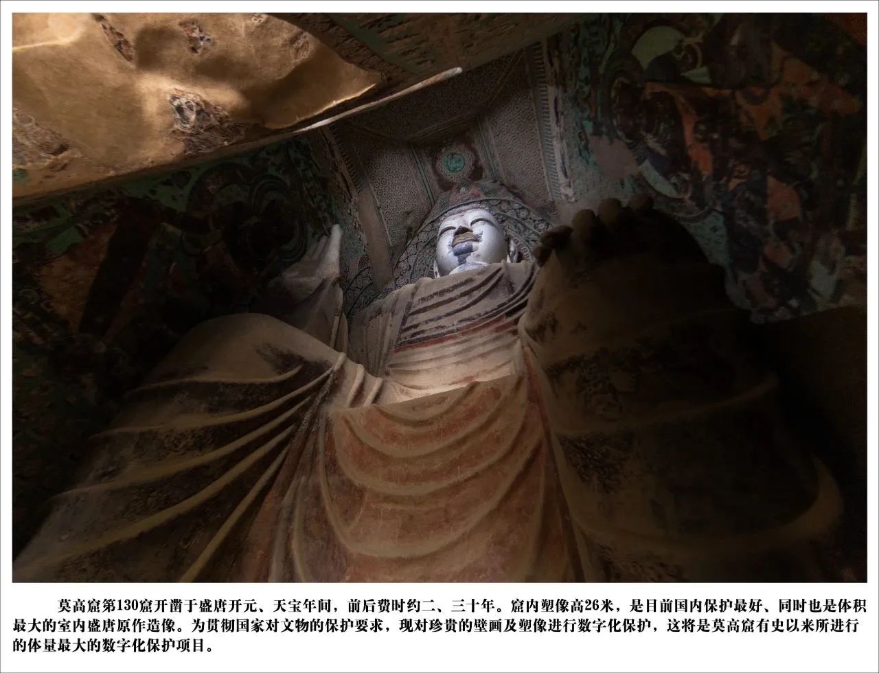 莫高窟第130窟开凿于盛唐开元、天宝年间,前后费时约二、三十年。窟内塑像高26米,是目前国内保护最好,同时也是莫高窟第二大的唐代造像。由于不可控的客观环境影响,莫高窟的壁画正在以一种不可逆转的方式衰退,对洞窟珍贵的壁画与塑像进行数字化保护刻不容缓。