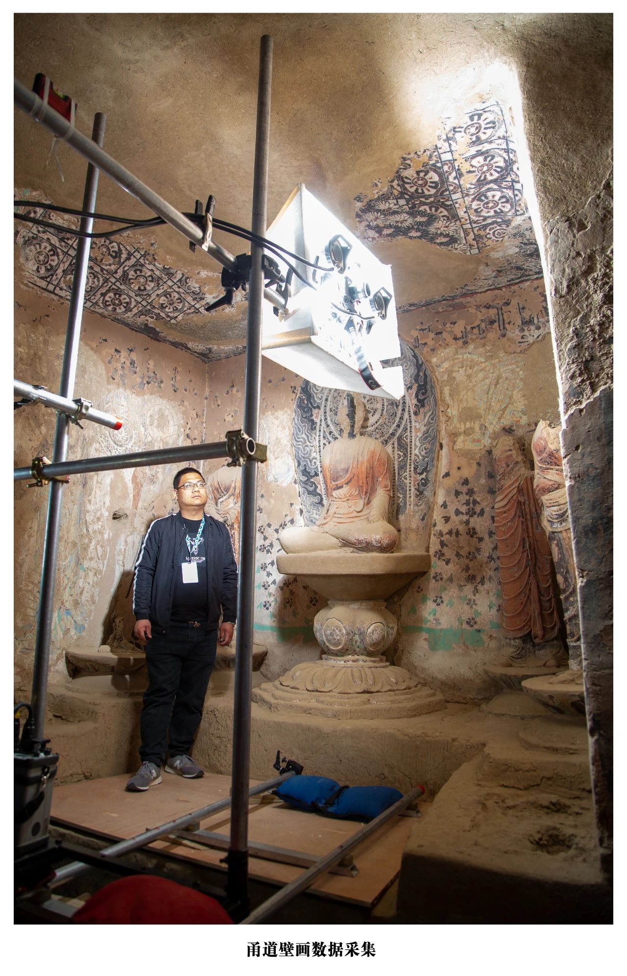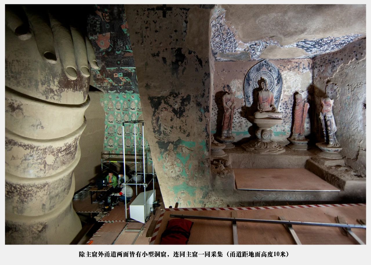 本组照片用镜头记录莫高窟第130洞窟数字化的过程,包括从一层到四层逐层升高的过程,并且从壁画数据采集现场、三维模型采集、数据处理与加工等方面进行影像记录。